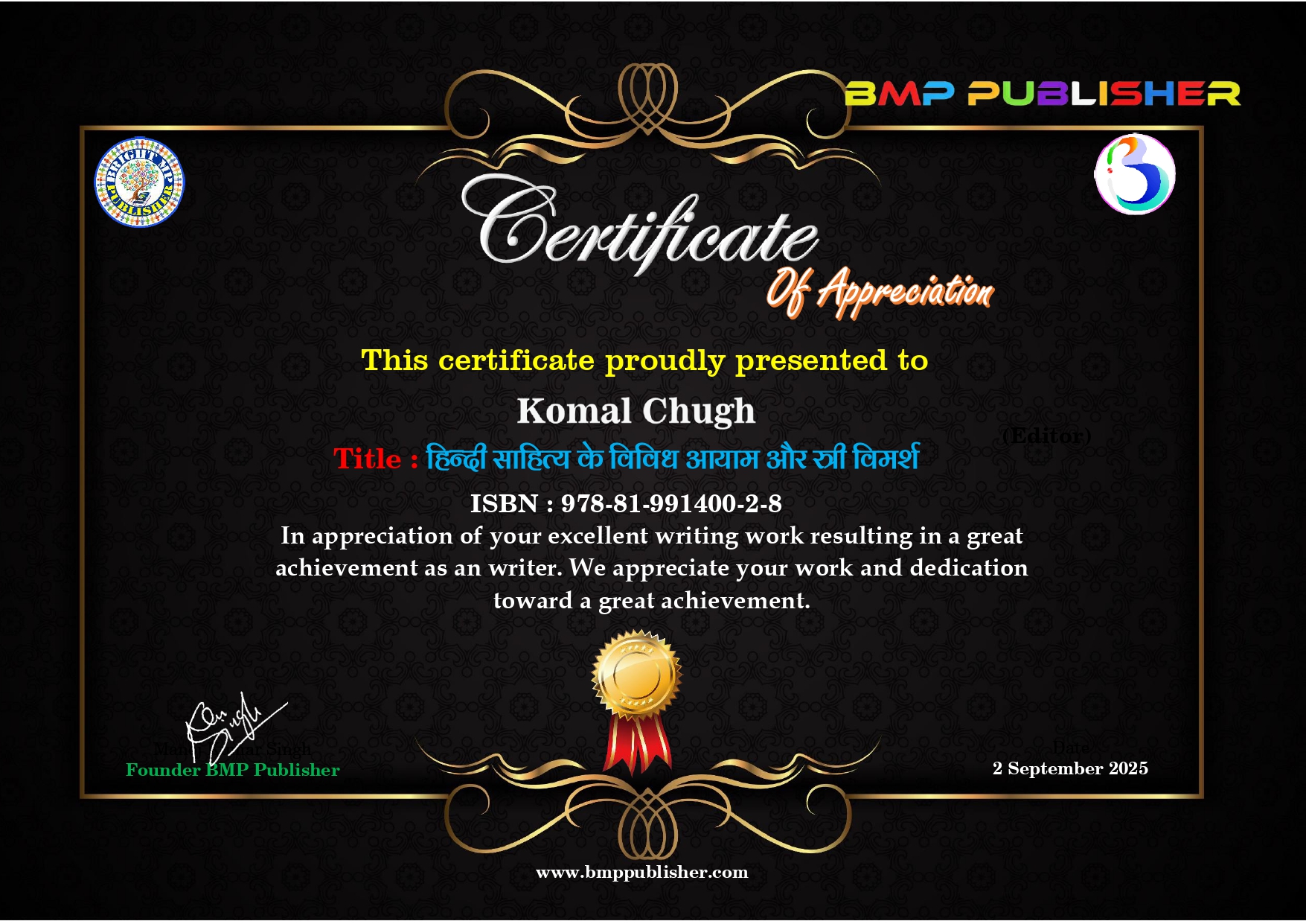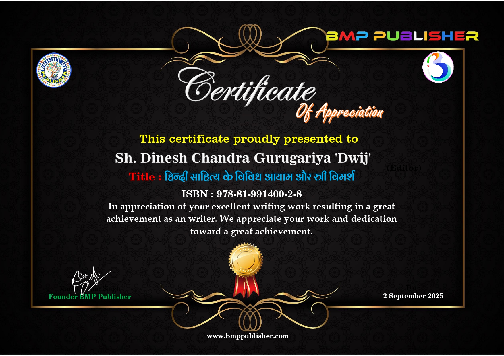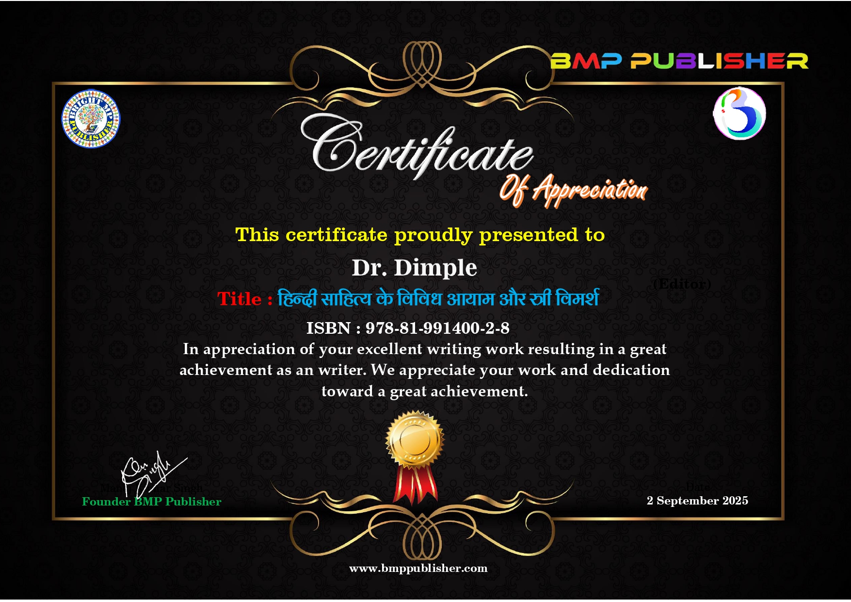 पुस्तक क्रमांक-18 ’हिन्दी साहित्य के विविध आयाम और स्त्री विमर्श’ के समस्त लेखकों के सम्मान-पत्र यहाँ पर अपलोड किये गये हैं। अनुरोध है कि समस्त रचनाकार अपने-अपने सम्मान-पत्र यहाँ से सेव/डाउनलोड कर लें।